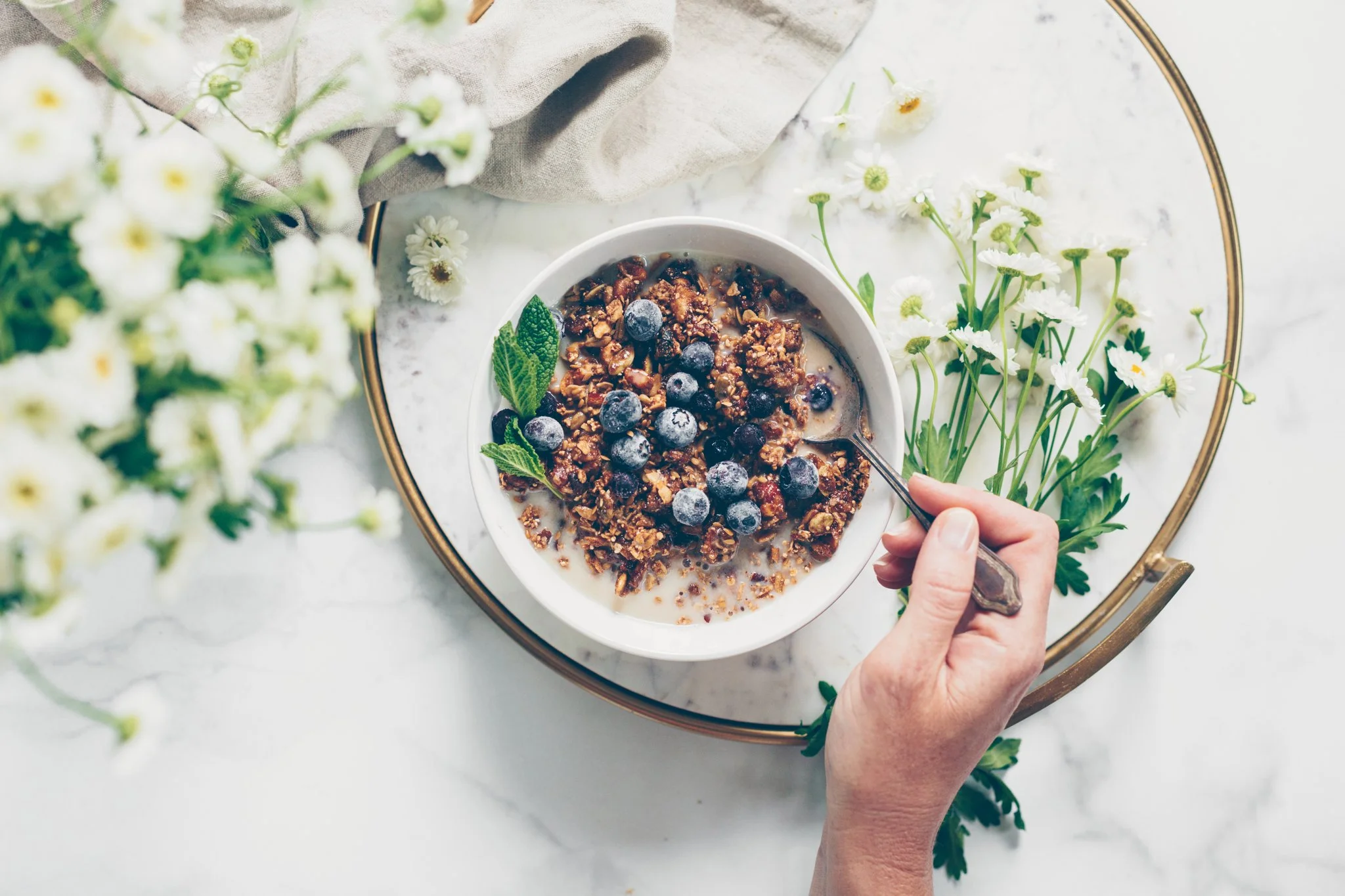 • Bowl of granola with blueberries and milk, garnished with mint leaves, on a table with white flowers and a hand holding a spoon.