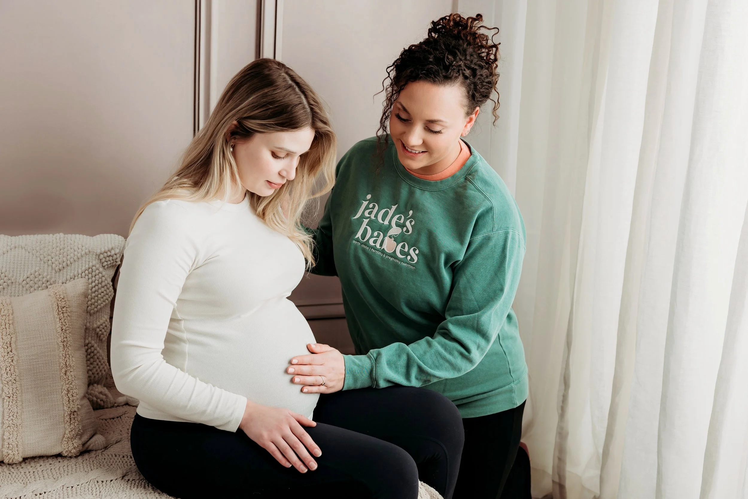 • Two women, one pregnant, sitting on a bed. The pregnant woman is wearing a white shirt and black pants, while the other woman in a green sweatshirt rests her hand on the pregnant woman's belly. The background features a light-colored wall and curtains.