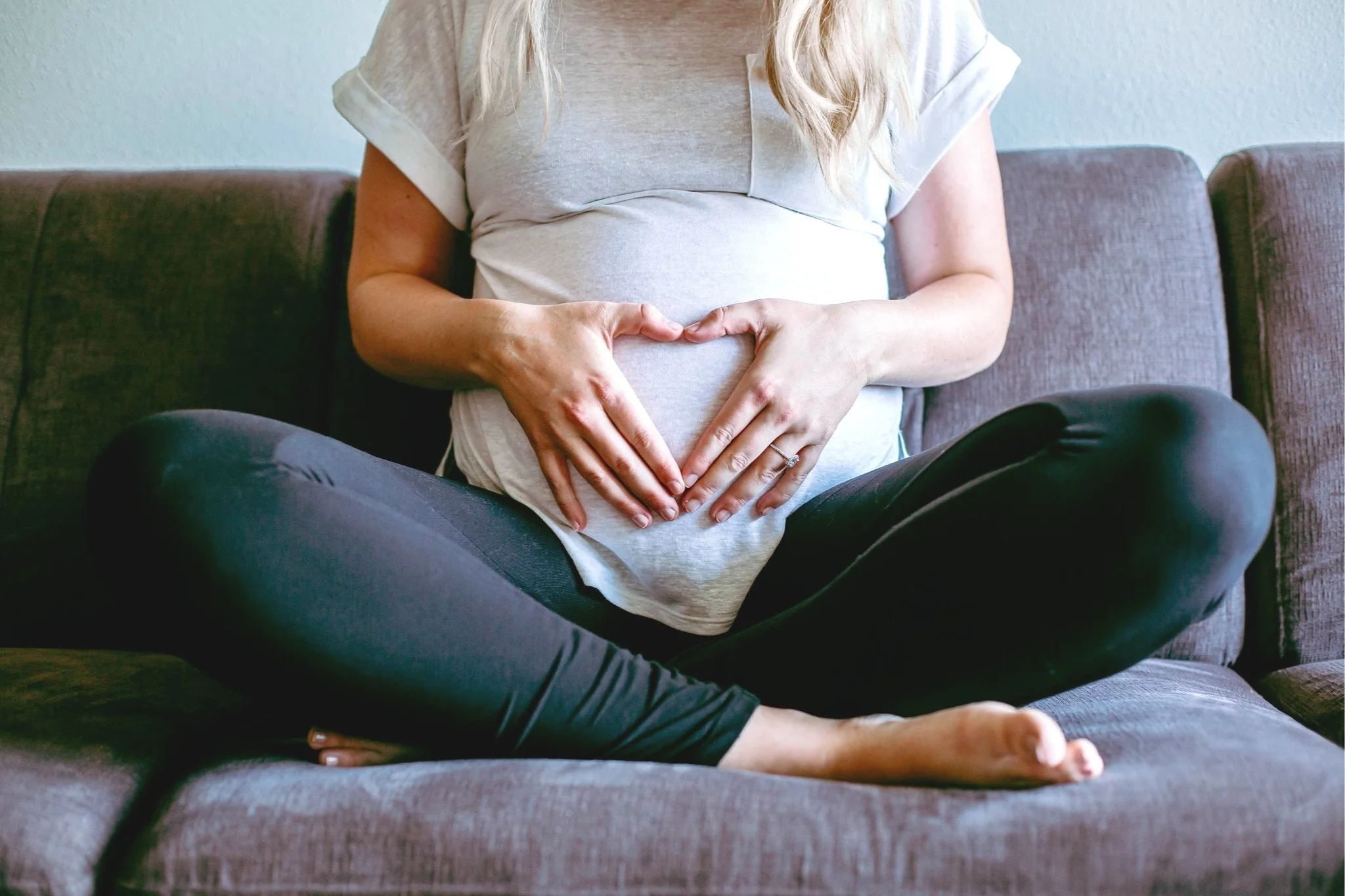 • Pregnant woman sitting cross-legged on a couch, forming a heart shape with hands over her belly.